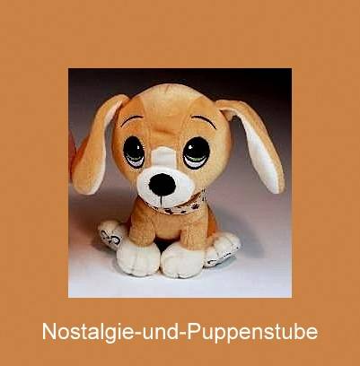 Der goldige kleine Knuddelhund ist ca. 19 cm groß. Er ist aus herrlich weichem Plüsch. Augen, Augenbrauen und Hinterpfötchen sind gestickt. Am Kopf hat er eine Schlaufe zum Aufhängen.